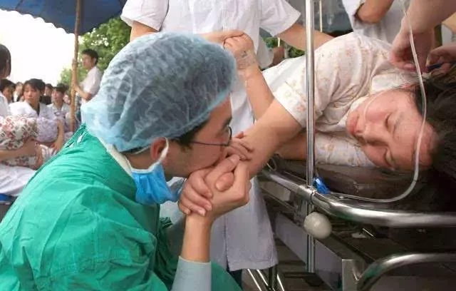 成都锦江区妇产科医院在地震后将即将生产的产妇转移到了室外,一名丈夫给妻子送上深情一吻,陪伴妻子