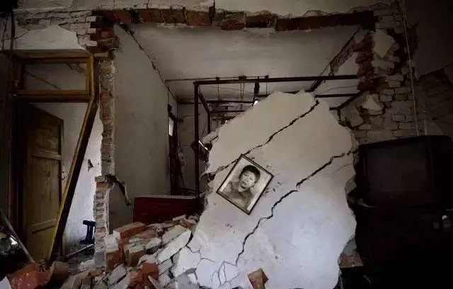 地震摧毁大批民房,断壁残垣之中悬挂在墙的照片随着墙壁倾斜