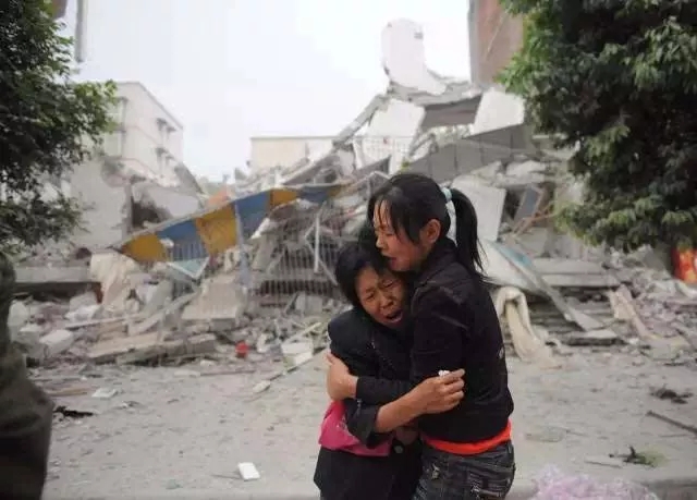 距震中最近的都江堰市受灾非常严重,一对母女相拥哭泣