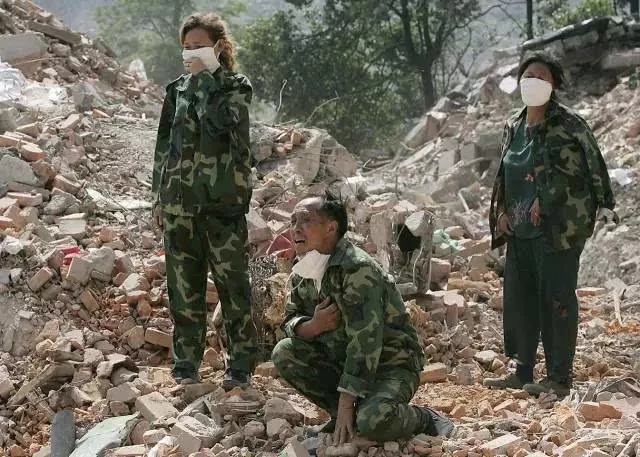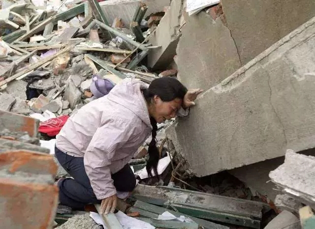 三位家属在废墟之中挖出亲人的遗体后痛哭