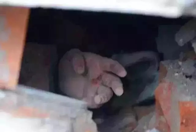 一名母亲在废墟之中守着她孩子的尸体大声哭泣