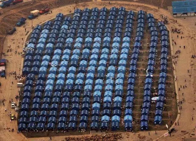 空中俯瞰受灾的绵竹地区,搭起的帐篷城