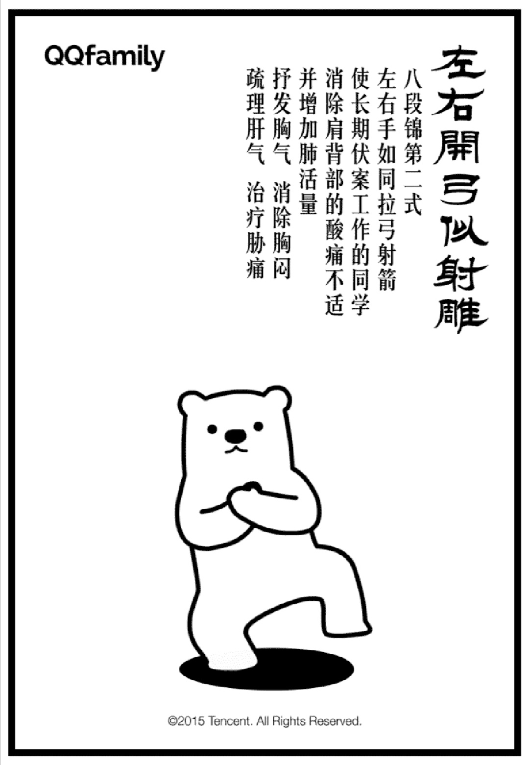 自然站立,左脚向左侧横开一步,身体下蹲成马步,双手虚握于两髋之外侧,随后自胸前向上划弧提于与胸前。右手向右拉至与肩平高,意如拉紧弓弦,开弓如满月;左手捏剑诀,向左侧伸出,转头向左,视线通过左手食指凝视远方,意如弓剑在手,等机而射。稍作停顿后,随即将身体上起,顺势将两手向下划弧收回胸前,并同时收回左腿,还原成自然站立。此为左式,右式反之。左右调换练习六次。