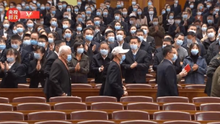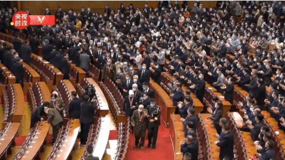 大会现场,志愿军老战士入场,现场全体起立,向老英雄致敬!