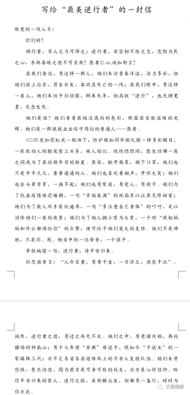 为了贯彻落实省、市关于疫情防控的系列重要指示精神,引导同学们正确面对疫情,体悟生命的意义,关注身边对抗疫情的闪光故事,培养同学们的社会责任担当意识。在乐天使的号召下,同学们通过语言文字宣传疫情防控工作中勇于担当作为、无私奉献的精神,创作出了一批主题鲜明、鼓舞斗志、弘扬正能量的抗疫作品为长春加油,向“逆行者”致敬,共同传递温暖和希望。