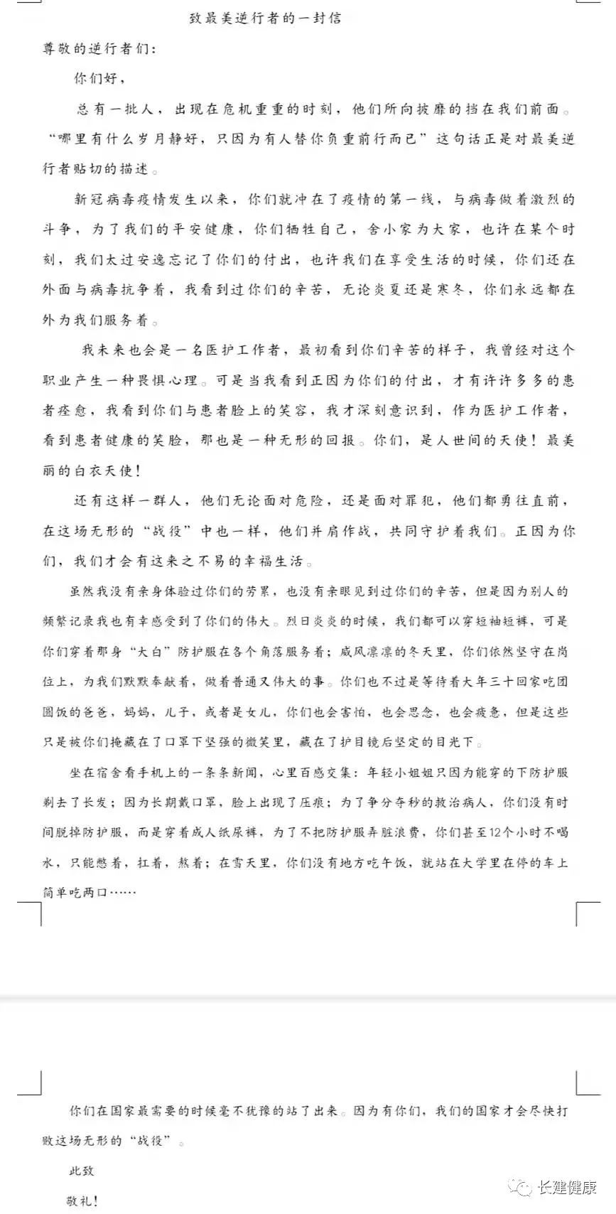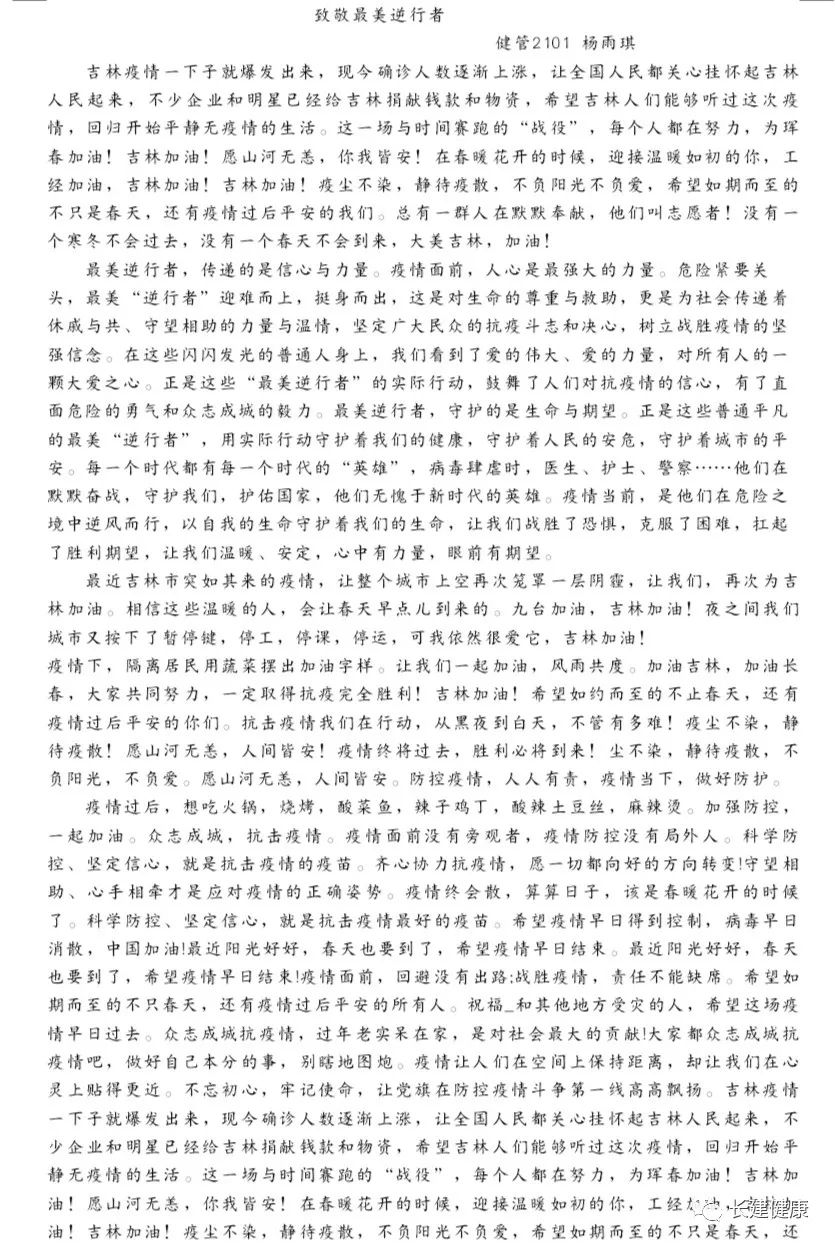 为了贯彻落实省、市关于疫情防控的系列重要指示精神,宣传防疫政策,鼓舞抗疫斗志,汇聚万众一心抗疫情感,助力打赢疫情防控攻坚战,激励同学们追求真善美、传递真善美。乐天使组织同学们积极撰写为吉林加油、向“最美志愿者”致敬的一封信以及疫情期间个人感悟。