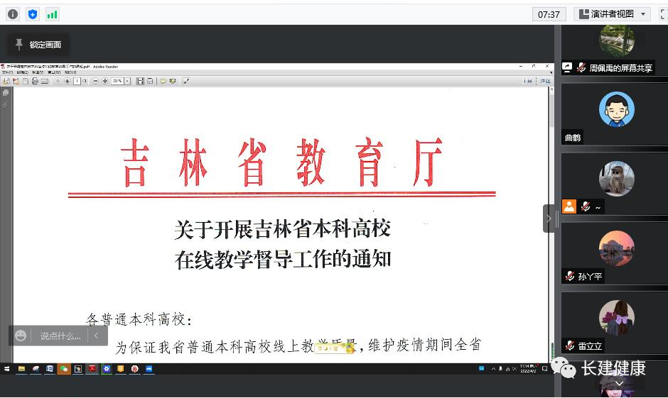 会议期间,李副经理就《关于开展吉林省本科高校在线教学督导工作的通知》进行了解读,对督导组于下周进校听课之事宜进行了通知与部署,并要求大家高度重视此次督导工作,同时宣布学院李晴、胡雪、刘春侠、韩婷婷四名教师入选督导听课名单。为了帮助老师更好的迎接在线督导,李副经理宣布学校成立由刘玉和教授、李薇教授、纪耀华教授、刘淑文教授共同组成的线上教学帮扶小组,并对以上四位教师进行一对一的帮扶指导。同时针对吉林省普通本科院校在线教学质量督导评价表的具体指标、评价依据、得分等项目,从课前准备、教学目标、课程思政、教学内容、教学方法、教学资源、教学评价、教学效果、教学亮点等维度做了逐项地、细致地讲解及分析,并要求学工系统、教师系统要将各项工作做到细致入微、有条不紊,严把各环节质量。