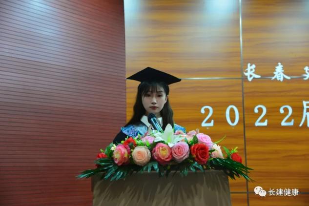 护理学1802班的孙铭潞同学作为毕业生代表,讲述了自己大学期间的经历与收获,同时还代表全体毕业生表达了对老师、同学以及父母的感恩之情,句句肺腑之言不仅饱含了对母校的感激之情,更树立了对未来的憧憬和目标。她在发言最后表示要时刻秉持“健康精神”,做“厚德至善、健行康民”的传承者、践行者和守护者,用心去感受学校的进步和发展,用行动去回报学院和老师的栽培,以拼搏的精神、昂扬的斗志、实干的作风去实现许下的庄严承诺。