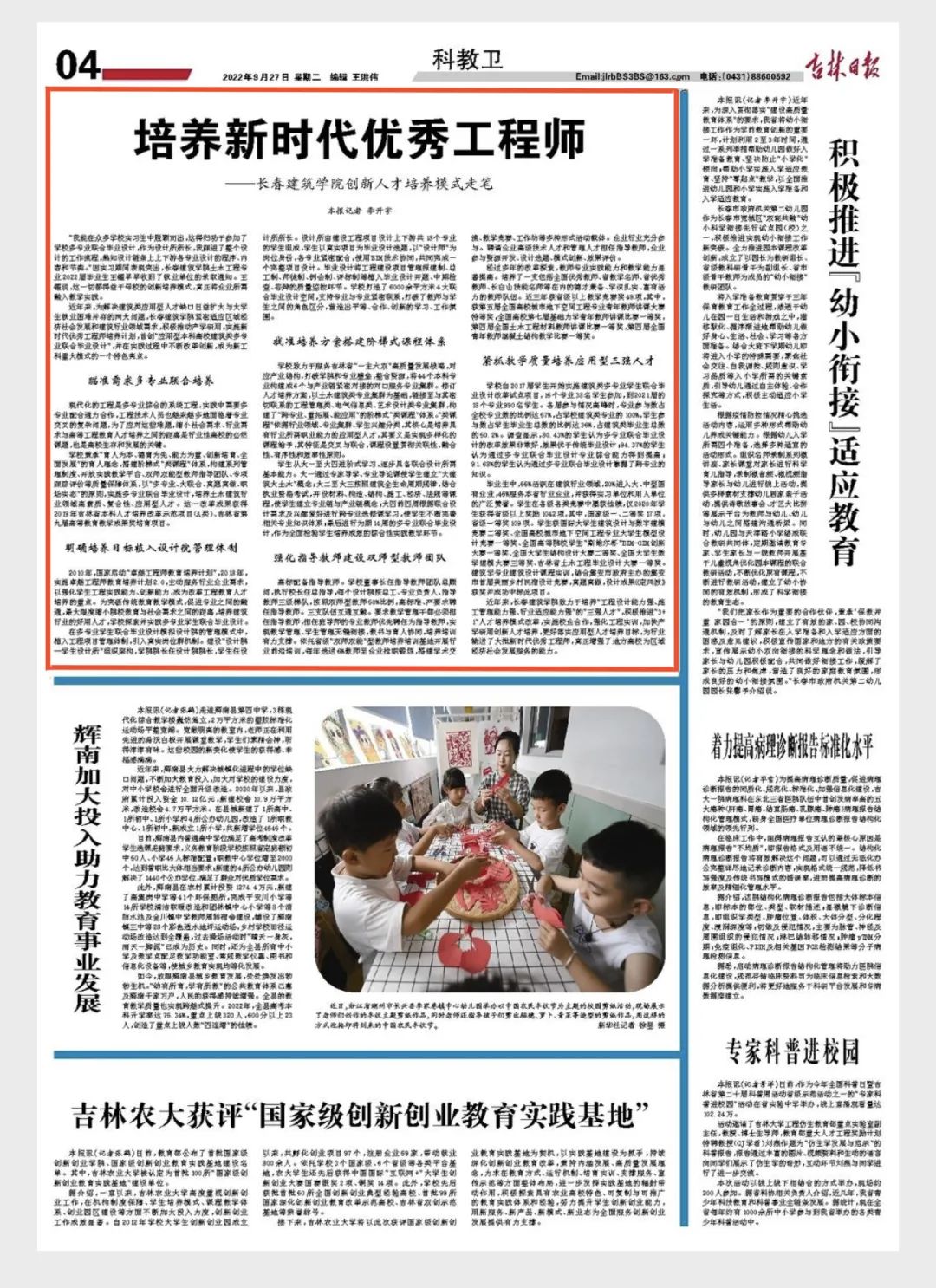 927日,《吉林日报》在04版科教卫专版刊登了题为《培养新时代优秀工程师——乐天使fun88官方网站创新人才培养模式走笔》的专题报道。报道阐述了学校实施新时代优秀工程师培养计划的重要意义,介绍了学校首创“应用型本科高校建筑类多专业联合毕业设计”的实践探索,彰显了学校不断创新人才培养模式改革、落实应用型人才培养目标、服务区域经济社会高质量发展等方面作出新贡献的责任担当。