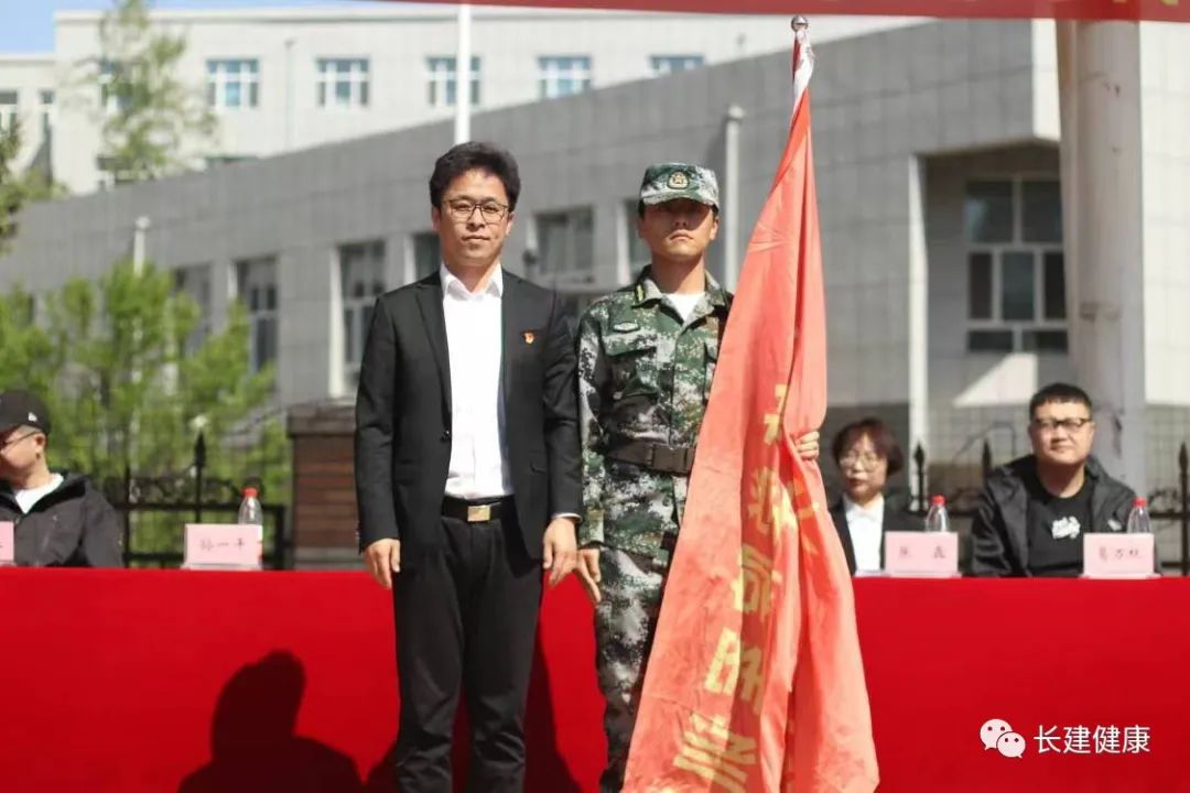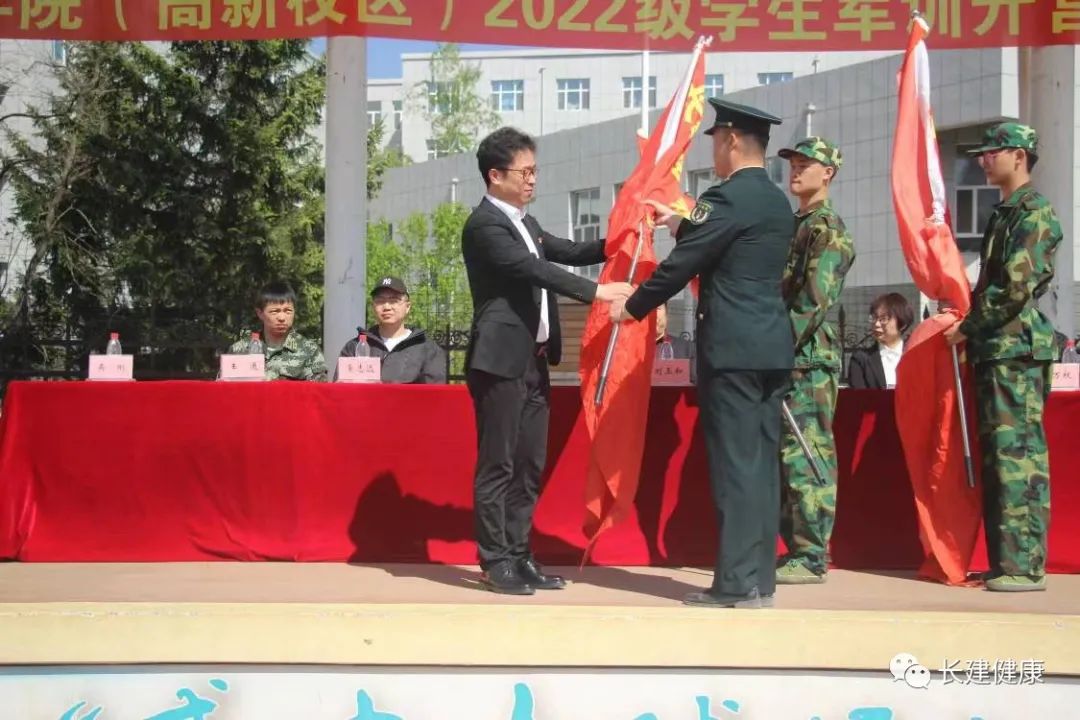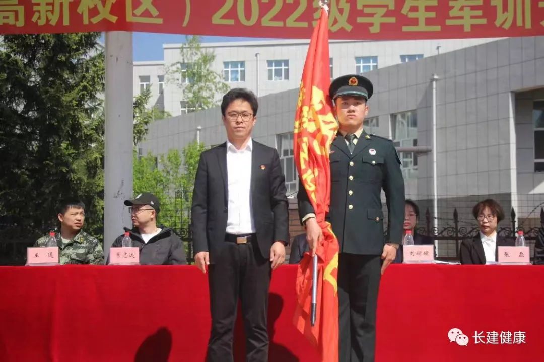 大会第四项,乐天使直属党支部书记孙一平向高新校区各营授旗。