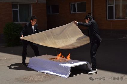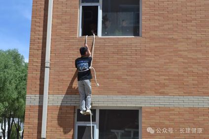 演练过程中,一名低楼层的同学由于逃生不便,在指导人员的指导下,该被困同学先将床单拧成绳子,一端紧固定在负载物体上,另一端沿窗口下垂至地面,并用毛巾保护手心顺绳滑下到地面,完成自救。接着,工作人员示范被困在楼层中无法逃出时的解决方法,他在窗口敲击物品或晃动鲜艳衣物等方式向外界发出求救信号,吸引救援人员的注意力以此得到救援。随后,主持人详细介绍了“窒息灭火法”,现场工作人员做了详细的示范,利用棉被快速扑灭初起火灾,进一步降低火灾带来的危险。险。