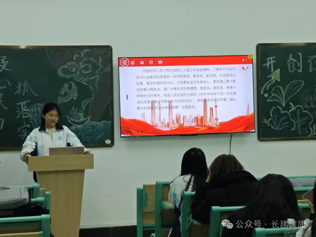 各班团支书为同学们讲述《习近平在省部级主要领导干部学习贯彻党的二十届三中全会精神专题研讨班开班式上发表重要讲话》有关内容,激励广大青年为实现中华民族伟大复兴的中国梦贡献青春力量;团支书带领同学们观看《学习贯彻党的二十届三中全会精神》纪录片,全面了解了进一步全面深化改革决定出台的时代背景、重要举措和核心任务,意识到肩负历史使命,要以坚定信念、昂扬斗志投身国家建设,为祖国贡献青春力量;同学们看完有感而发,表明将以此学习活动为契机,迅速把思想和行动统一到全会精神上来。团会结束后,同学们纷纷表示:“作为新时代新青年,一定会立足岗位、踔厉奋发、勇毅前行,扛起新使命,展现新担当,为中国梦实现作出更大贡献。”
