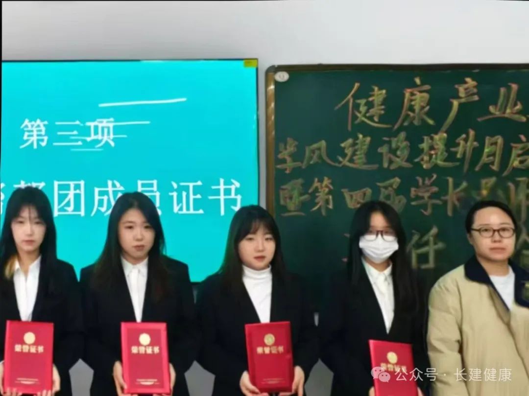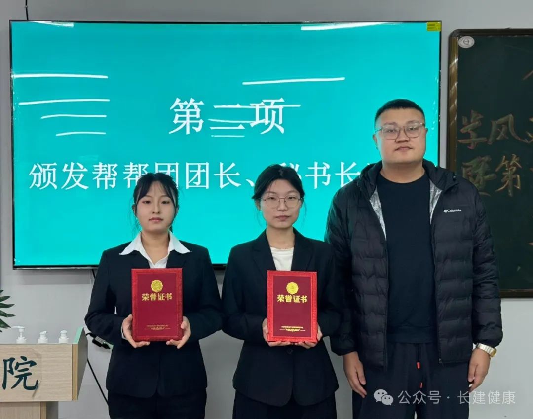 24级专升本辅导员张笑也为帮帮团成员邵禹博、李佳佳、郭彦辛、王诗淇同学颁发聘书。