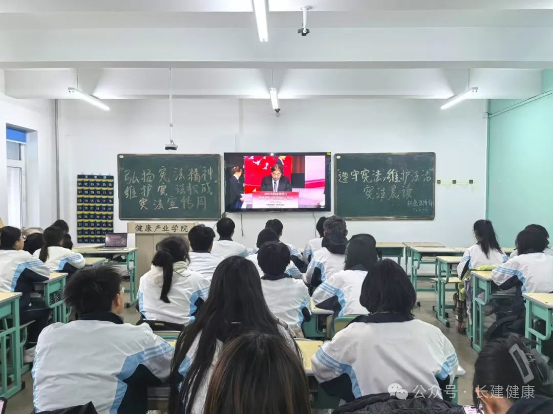 同学们通过普法网观看主会场直播,跟读宪法部分条文,晨读内容围绕宪法的基本原则、国家机构设置、公民的权利与义务等内容进行,朗朗晨读声响彻教室,字字铿锵、句句有力,使同学们领会到宪法和国家充分融合密不可分,国家尊重和保障每一个公民的人权,每一个人都享有宪法和法律规定的权利,同时也必需履行宪法和法律规定的义务。同学们一起跟唱了宪法之歌《宪法伴我们成长》,共同在歌声中领悟宪法精神,感受宪法力量。晨读结束后,同学们纷纷表示:“通过学习宪法,更加敬重这部国家的根本法。它不仅确立了国家的基本原则和框架,还保障了公民的自由和权利。宪法的学习让我们认识到,作为公民,我们既要行使自己的权利,也要履行对国家的义务,共同维护社会的和谐稳定。”