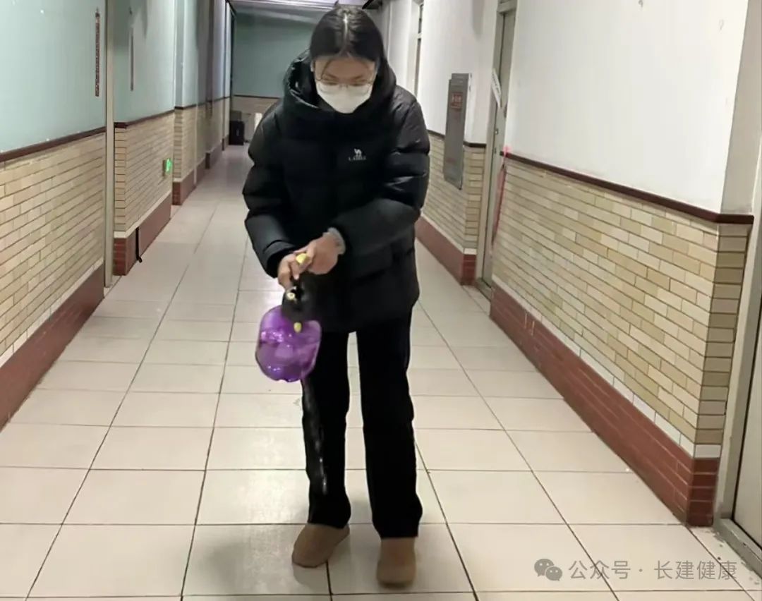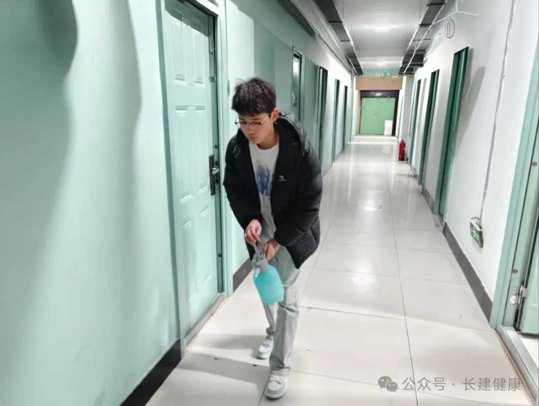 紧接着员工干部转移到寝室楼展开清扫。在寝室楼,他们认真清扫走廊、楼梯间等各个角落,随后按照科学流程对教学楼和寝室楼全面消毒,他们不放过任何卫生死角,全力为同学打造安全健康的学习环境,筑牢新学期的健康防线。期间,他们还提醒同学要时刻开窗通风、注意个人卫生。活动结束后,员工干部纷纷表示:“此次活动让我们更加明白自身使命,我们会心怀热情与责任,继续践行“我为同学办实事”宗旨,发扬服务精神,为营造整洁、舒适的生活环境贡献一份力量。”