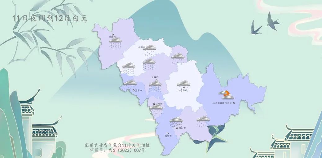 明天夜间到后天白天,全省多云有时阴,通化、白山西部有雨夹雪转中雪,白城、松原南部、长春西部和南部、四平东部有中雨,松原北部、长春东北部、四平西部、辽源、吉林市、白山东部、长白山保护开发区有小雨或雨夹雪。