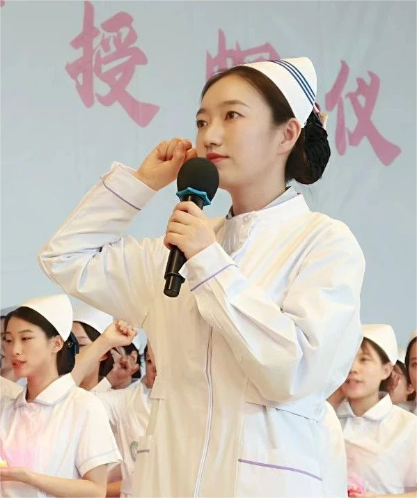 全体员工头戴圣洁燕尾帽,左手托烛,面向南丁格尔画像,在雷立立老师带领下庄严宣誓:"我志愿学习护理专业,把毕生精力奉献给护理事业"。铿锵誓言彰显决心,他们将怀揣感恩,不负韶华,为护理事业全力拼搏。